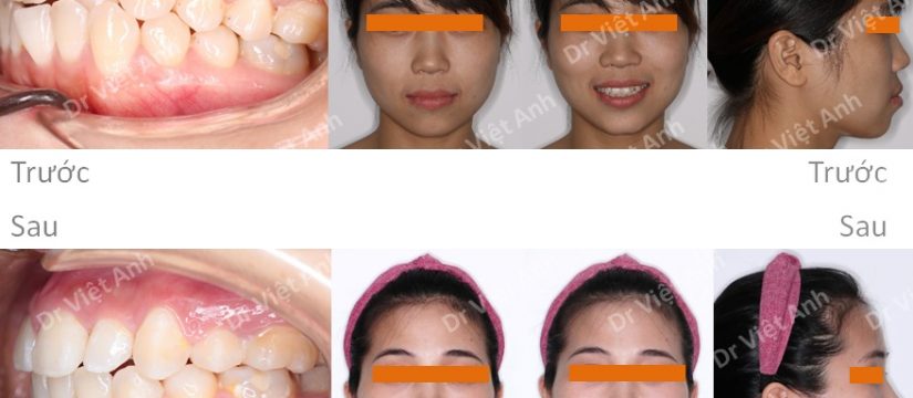 So sánh ảnh trước và sau niềng răng mặt trong: răng đỡ chìa, nụ cười đẹp hơn nhiều, góc nghiêng giảm nhô môi, không bị kéo vào quá mức thành móm. Mũi và cằm nhìn cao hơn.