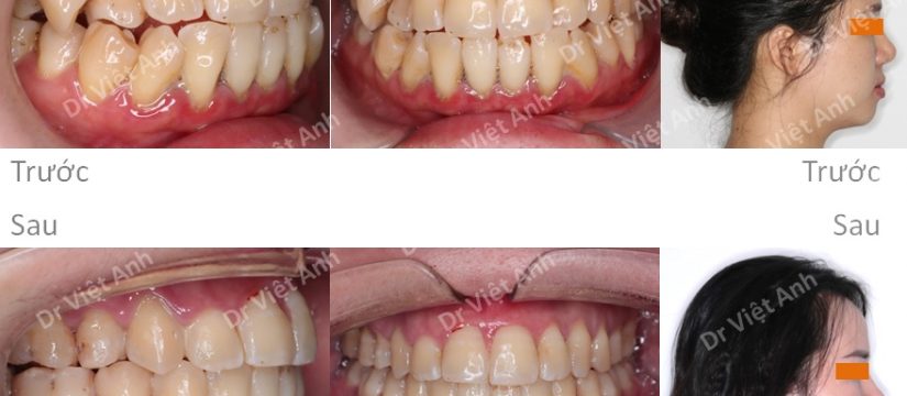 So sánh ảnh trước và sau niềng răng mặt trong: răng đều hơn hẳn, răng cửa trên phủ ra ngoài răng cửa dưới, không còn bị khớp cắn đối đầu; góc nghiêng hài hòa hơn do kéo môi dưới vào phía sau môi trên.