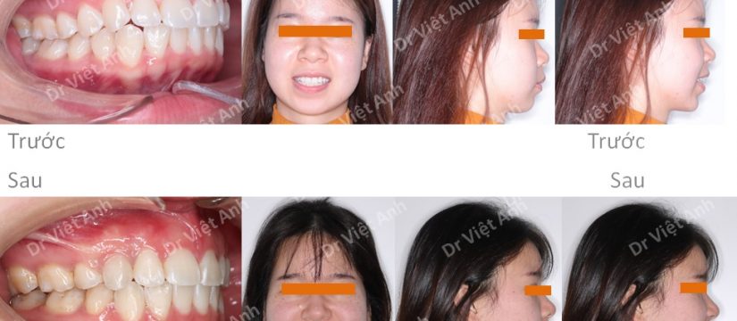 So sánh ảnh trước và sau niềng răng mặt trong: răng đều hơn và đỡ chìa, khi cười răng đỡ đưa ra hơn, góc nghiêng thay đổi hẳn, môi bớt nhô, mũi và cằm nhìn cao lên nhiều.