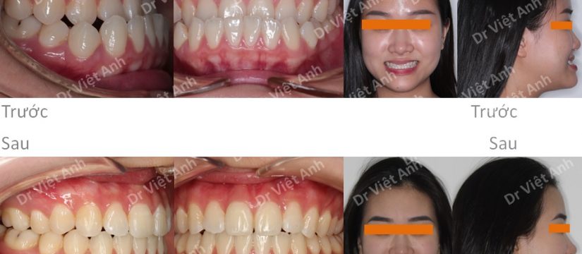 So sánh ảnh trước và sau niềng răng mắc cài mặt trong: hết khớp cắn ngược, tương quan khớp cắn từ hạng III chỉnh về hạng I, nụ cười đẹp hơn, góc nghiêng đỡ móm