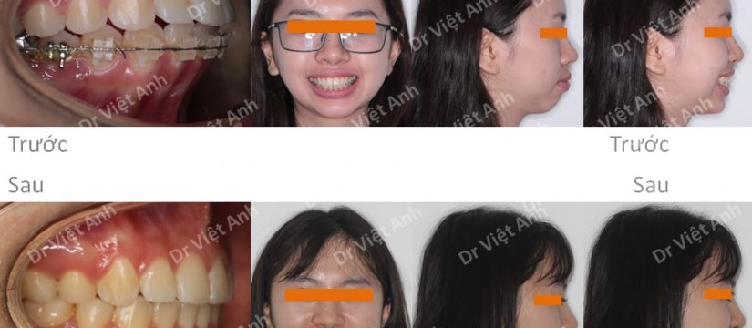 So sánh ảnh trước và sau niềng răng mắc cài mặt trong: răng đỡ chìa, nụ cười đẹp hơn hẳn, góc nghiêng đỡ hô, cằm đỡ lẹm, cải thiện rất nhiều.