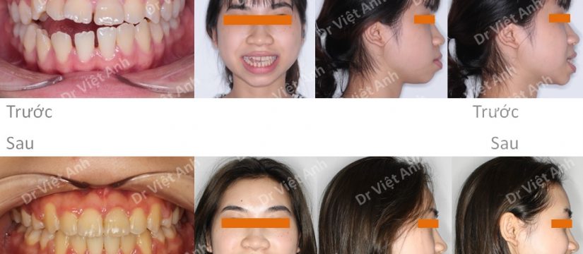 So sánh ảnh trước và sau niềng răng mắc cài pha lê: hết khớp cắn hở, các khe răng thưa được kéo khít, nụ cười đẹp hơn hẳn, góc nghiêng cải thiện nhiều, môi đỡ vẩu hẳn, cằm đỡ lẹm